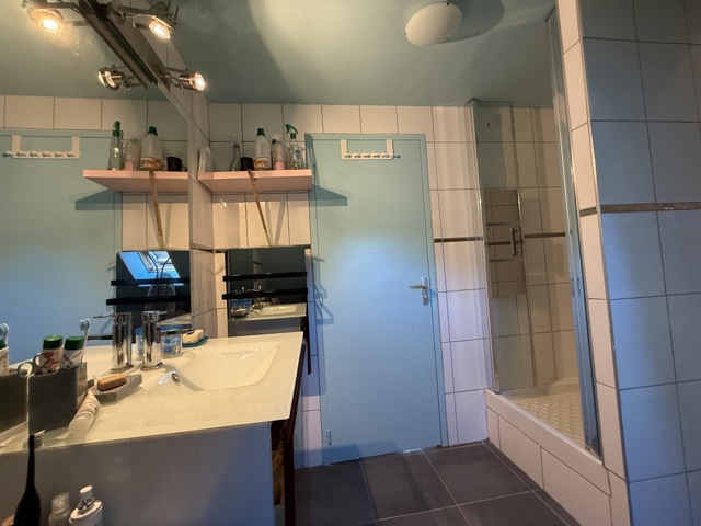Au 1er étage : Un palier ouvert sur salon, buanderie, chambre avec rangements, salle de bains, WC, cuisine aménagée et équipée.