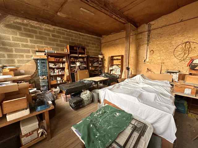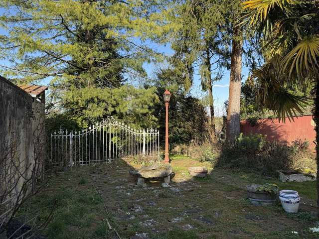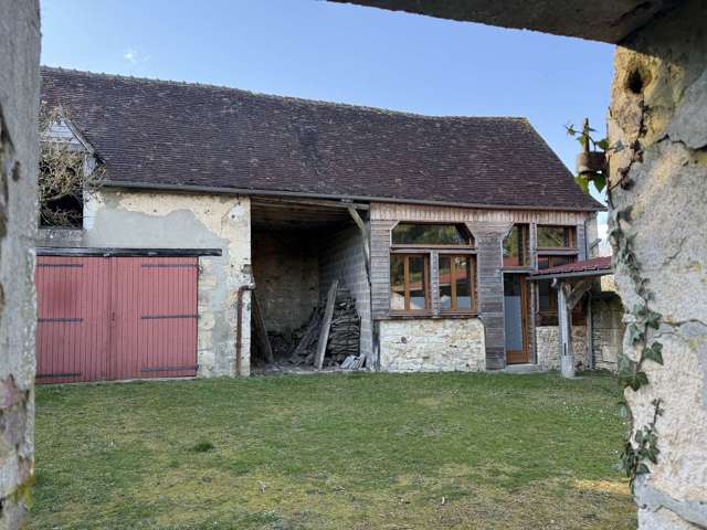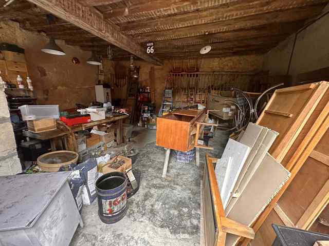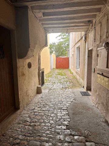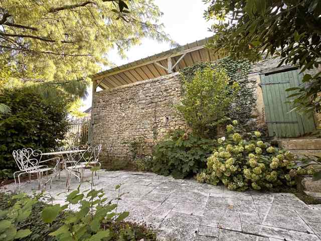Cour en côté dans laquelle second bâtiment couvert en tuiles anciennes renfermant remise et garage.