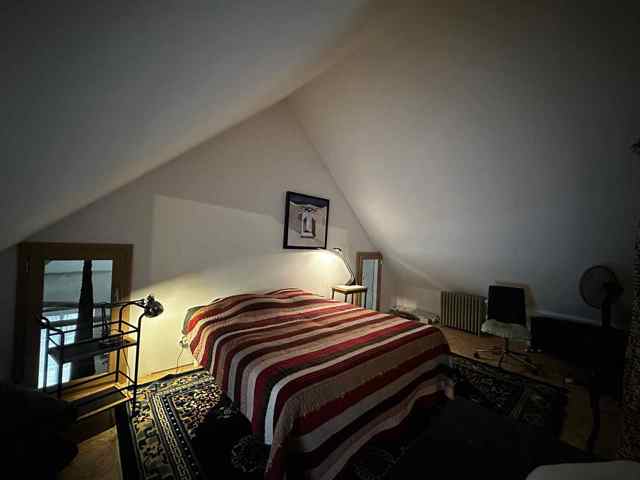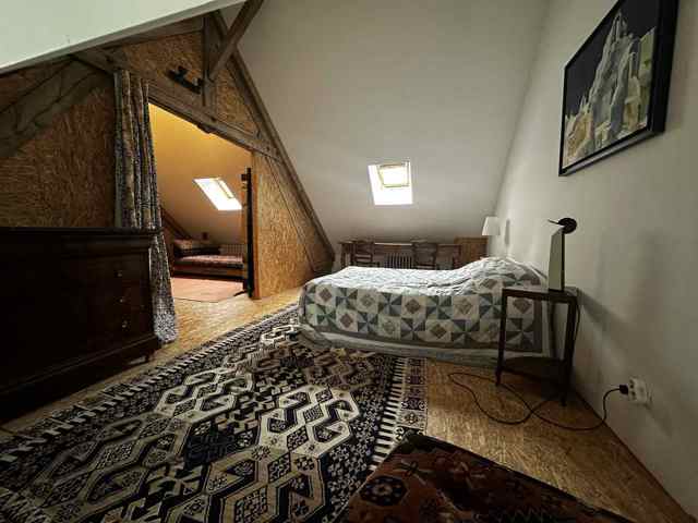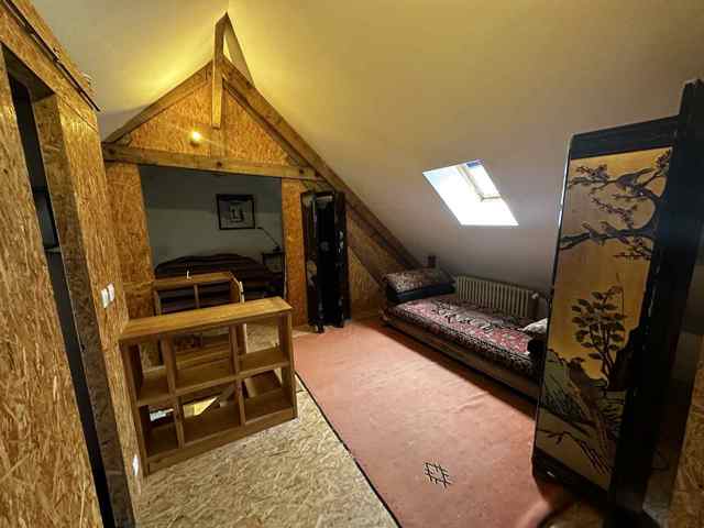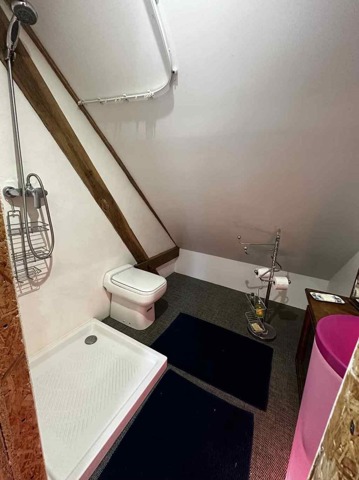 A l’étage : palier, salle d’eau avec wc, deux chambres mansardées.