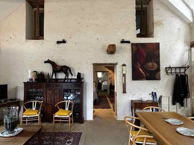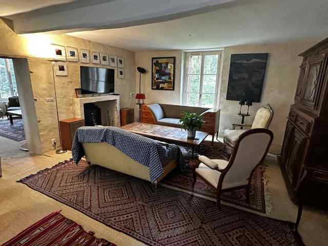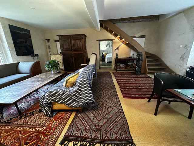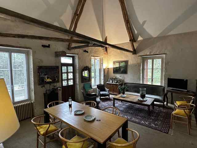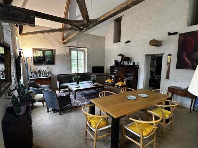 Au rez-de-chaussée : séjour cathédrale, en retour sur l’aile au Sud cuisine aménagée et équipée, wc avec lave main ; et d’autre côté salon avec cheminée, et à la suite une chambre avec dégagement et salle d’eau privative avec wc indépendant.